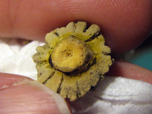 Cami threw this up. Looks organic, but I can not identify it. Also, it looks like it was in her stomach for a while, It isn't anything from my home that I can figure out. Could it be from commercial food? It's about 5/8" in diameter. As it is drying it is turning grayish.