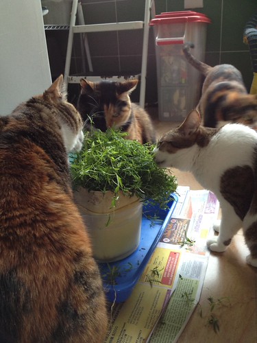 Here you can see some of them munching on green mummy got from the market. This is a kind of fresh chinese herb for the cure of tumor, cancer & prevent UTI. This is only available during early summer time. My cats love it, it is their green! Rosy is the white tabby on the right; nom, nom, nom!