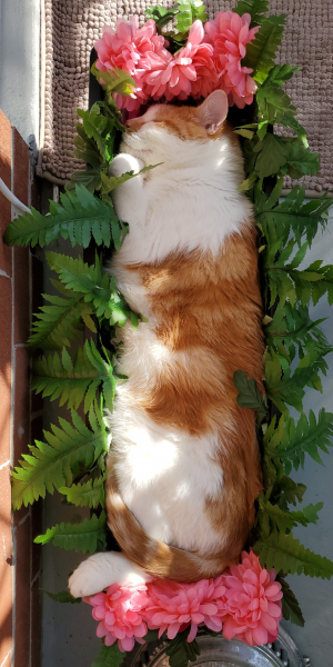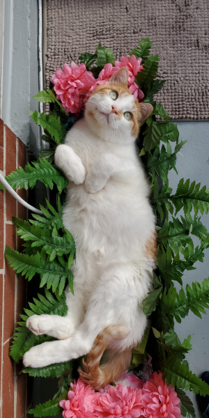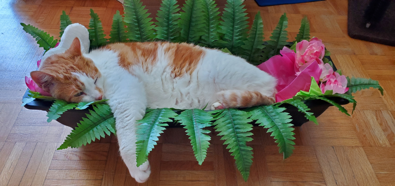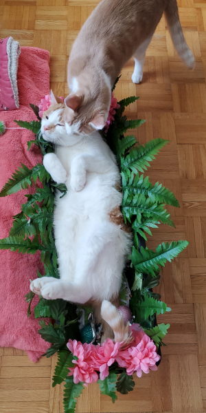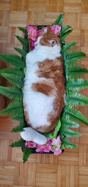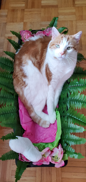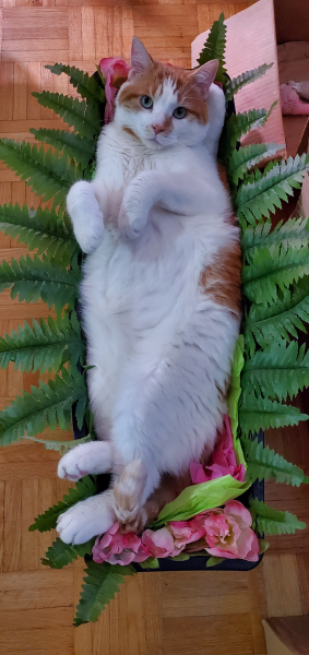 Oh my God, she is just too darn adorable. Great job making the flower boxThere's a story behind the planter box and a video too (I'll see if I can find it later) but basically I always plant a garden out on my balcony and one spring I had this long planter filled with soil and of course Nestle would go and sit on top of it. It would have been fine if not for the fact that he would be covered in soil afterwards. So I decided to make him his own planter box for his birthday with fake plants and flowers and he LOVED it! I have many photos of him enjoying his flower box.
