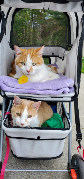 It's a kitty stroller. The top part can be closed off completely so they're safe. The bottom part is just storage but Peanut got in there temporarily during our walk one time haha. I did see a double pet stroller online (amazon) so you can def find one. But even the single one holds Nestle and Peanut together in the enclosed part.