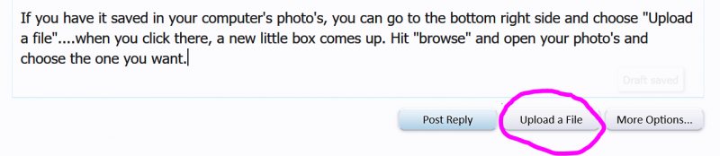 If you have it saved in your computer's photo's, you can go to the bottom right side and choose "Upload a file"....when you click there, a new little box comes up. Hit "browse" and open your photo's and choose the one you want.