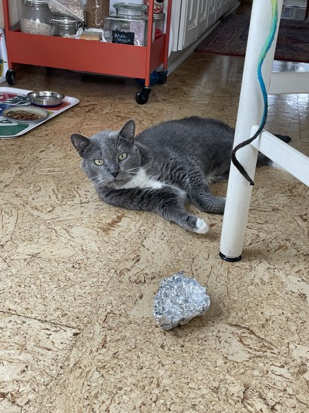 I tried an experiment with her feeder, after reading @Bandit's Mom and @Jason - Kona's Dad 's discussion yesterday about whisker fatigue. Bella is acting like a wild savage with her feeder, and I realized that the cups are deep. So I put balled aluminium foil in the cups and her food in a jar lid (I'll get some small dishes). I was there when it opened at +4 yesterday night, my son was playing trumpet at the hockey game so we had a late night! She was calmer but after she ate, she dug out everything, I guess in case there might have been some food hidden there! And she did the same with the next one, the aluminium foil balls and the lids were scattered around the kitchen this morning ;)