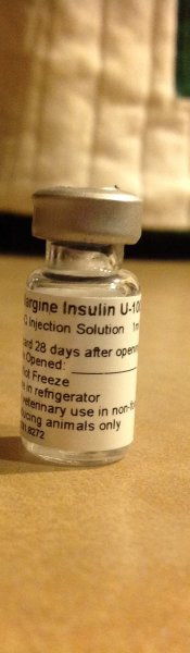 thanks for posting those pictures. I've been out of town and thinking of you guys and wondering what happened with his insulin. I'm noticing in that photo that it says that it's compounded (which should not be true of Lantus) and also that it's for veterinary use only. Lantus is a human insulin.
