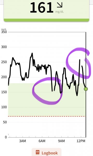 I really thought we would see some action last night with the dose increase but really stayed flat. One low in the 200s and the rest in the 300s. Hopefully it kicks in soon. Whenever it is I am sure it will be the middle of the night!
