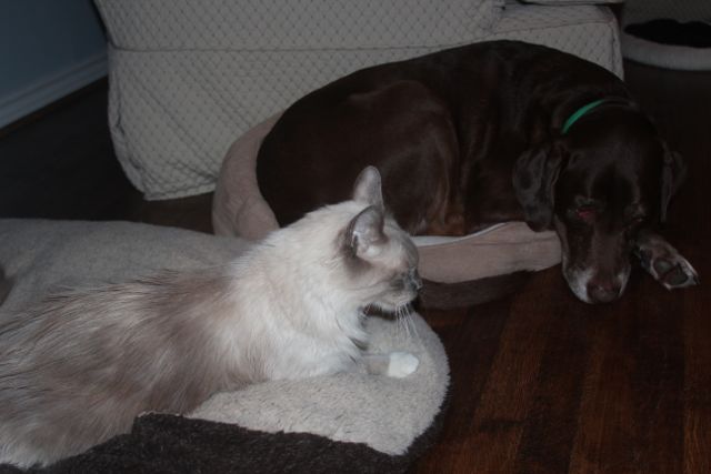 Simon and Logan are pals--or at least tolerate one another. My civvie Molly, being the calico that she is, will not be in the same room with the dog. And they have been housemates for 8 years.