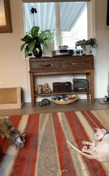 Let’s see where today takes us… I finally got my living room cleaned out enough to lay down the rug, which was inexpensive and kind a looks like it, but it’ll do till I find something I really like, The cats had fun on it with the Cat Dancer toy!