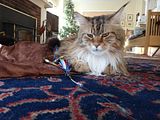 Cold and snowy here this morning (3 degrees F. and 5 inches of new snow--very beautiful). Rusty didn't want to go outside!!! He had a good night sleeping between his beans. He has accepted the fact that his Auntie Lindabean has gone home and is already looking forward to her next visit. I had a pretty good play with him with the crinklesack and wand this morning, even though it wasn't up to the standard set by Linda!