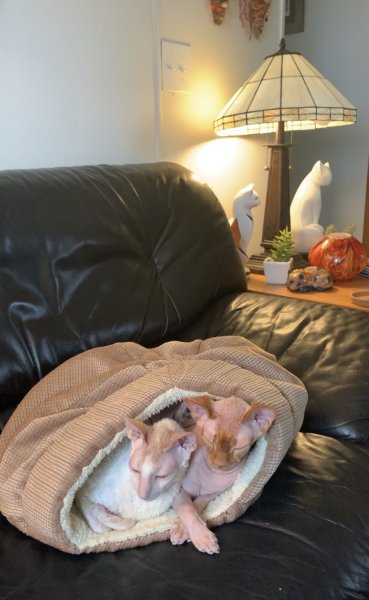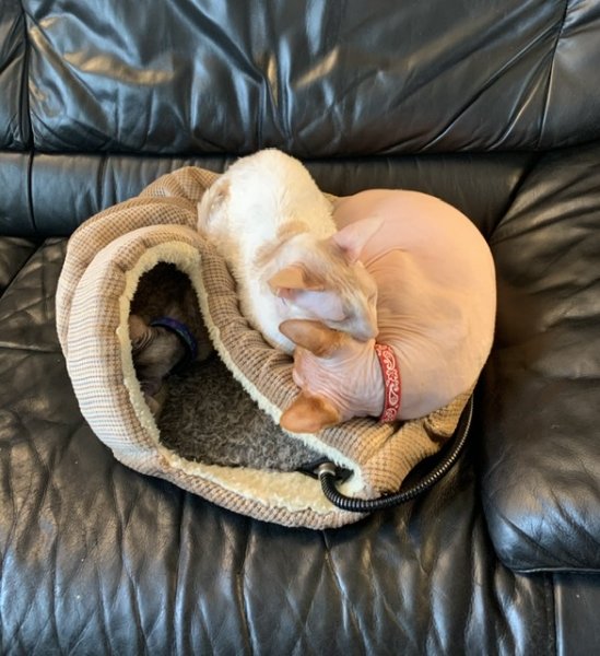 Photo of the cat crew curled up in their heated burrow bed, the shape looks like a heart to me...