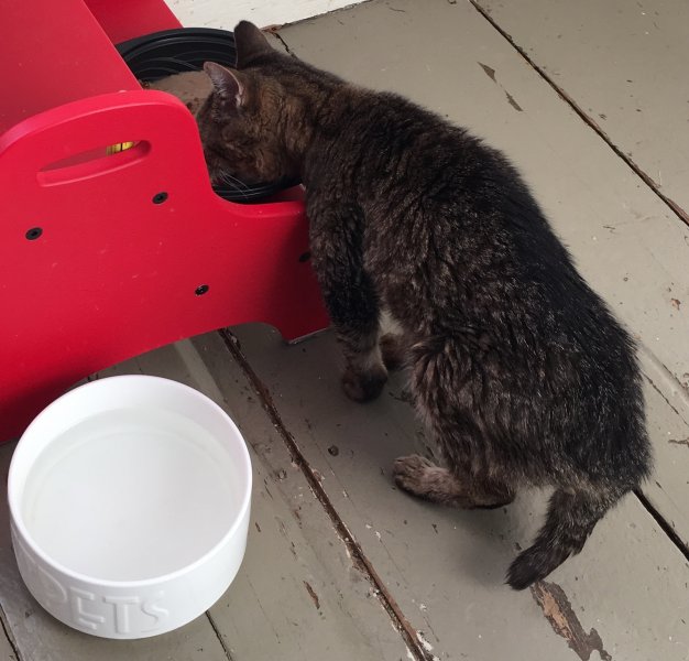 This morning made it upstairs with fud. Bella peeking through the balusters, dancer guiding me up the stairs. Ate pretty well. Azalea sound asleep but perky soon as she awoke. Pranced into the other bedroom and sampled Bella's and Dancer's breffis. As if in a changing of the guard, dancer went into Azalea's room and came out, her polydactyl paws coated with litter from azalea's LB.