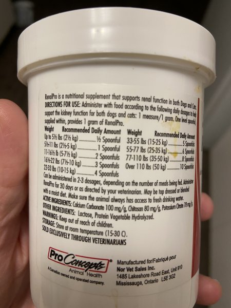 This is the renal supplement we gave to him, and all our boys actually, for a time. Cosmo received it, until more recently, but we were feeding FF at the time, which has a higher phosphorus level than his food now, so preventative for Cosmo :)