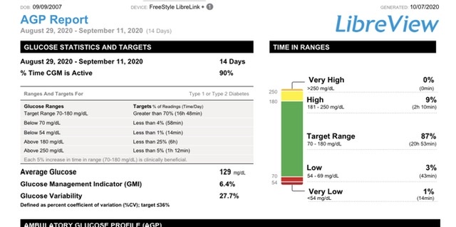 I have attached some pics of the Libre, placement of Libre on T and his Kitty Kollar. I have also attached some examples of just some of the data you are able to get from the CGM. One showing a transient low point. I liked that I knew exactly how much time he spent lower, in range, high and that it determines glucose variability on the LibreView Report. The report for one sensor is 22 or 23 pages