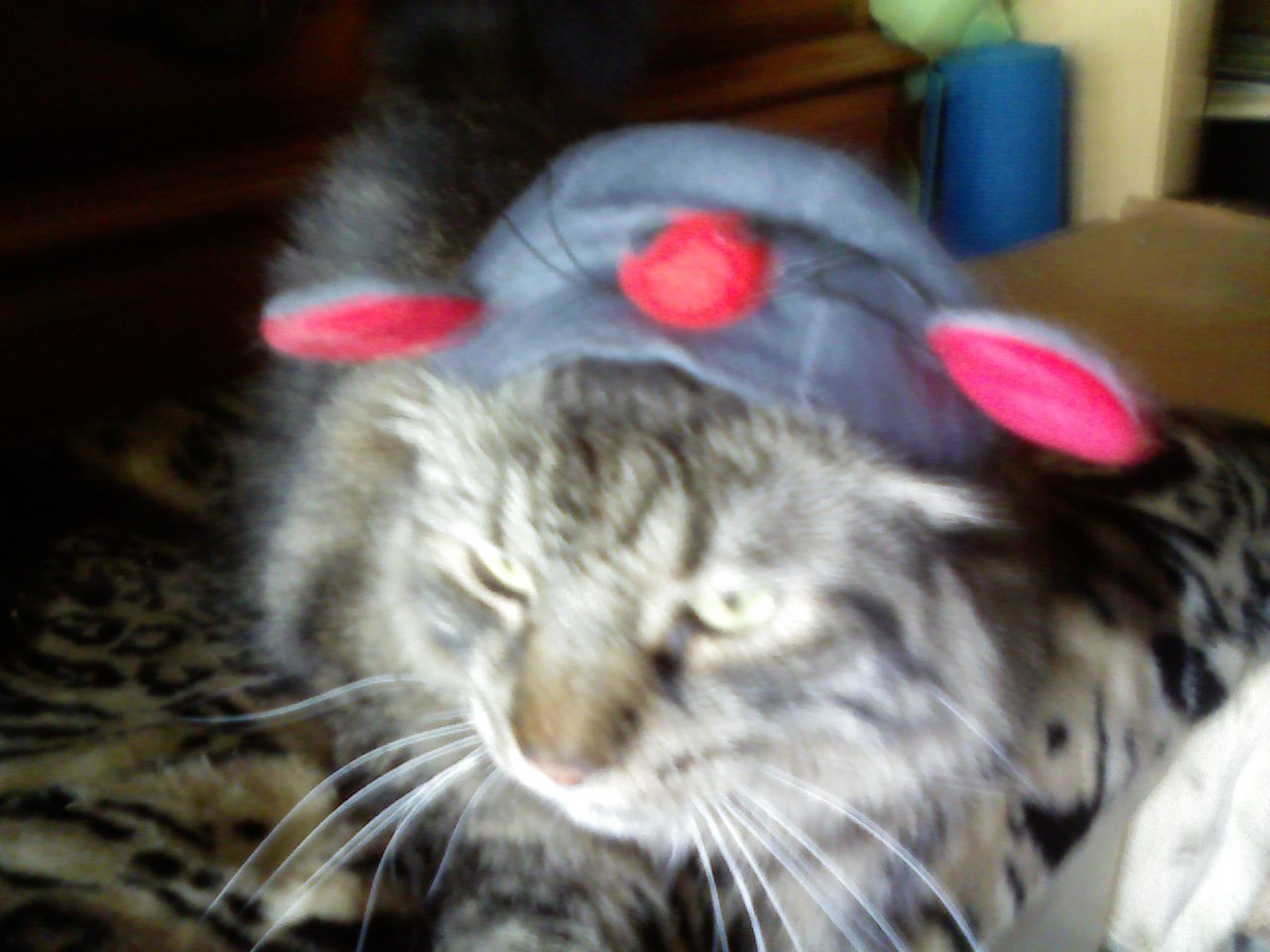 She is not a happy camper with her halloween costume on. Should be a devil instead of a mouse. Oh well, can't win them all. Using me as a trampoline to get on top of the bookcases and deciding in the middle of the night she needs attention. If not provided, she nips me. That gets a response. She has also gotten into two arguments with Waif. When she turns to leave after she has harassed him, he smacks her butt and she really has a fit. What a cat.