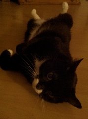 I love her pictures...it cracks me up how she sleeps on her back with her little toes curled. My Noah - also a tuxedo - does the same thing, although he's usually semi-on his side.