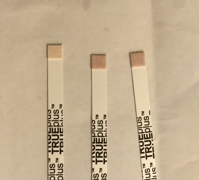 *Note: In the photo with the ketone test strips, the strip on far left is an untested strip for comparison to the other 2 test strips done from the same urine sample tonight on the pee pad.