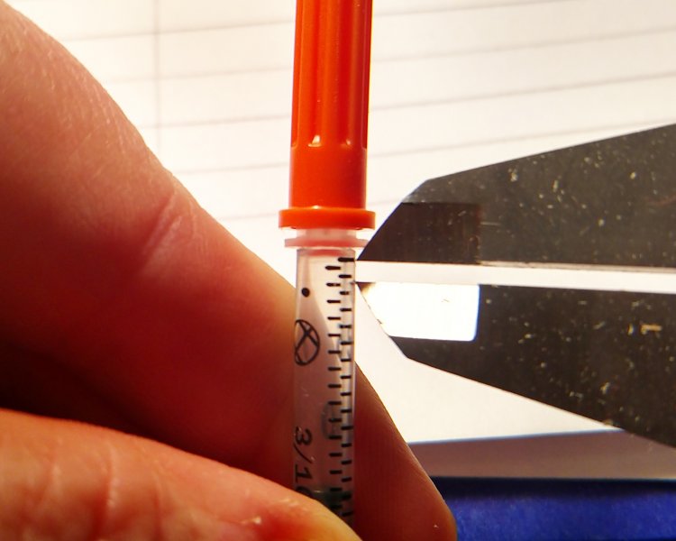 What’s most important is that you put the upper jaw at the same place every time. I haven’t used ReliOn syringes with calipers but the measurement was derived by putting the upper arm below the hub. I can see your photo now on my Mac (I was on a tablet before) and that looks pretty good. The one thing to be sure of is that you don’t use the zero line at the top for where to place your upper arm. They can be really inaccurate. Use the bottom of the plastic ring that goes around the top below the hub. I put a red line in your photo (below) for where I’m talking about. Let me know if that helps.