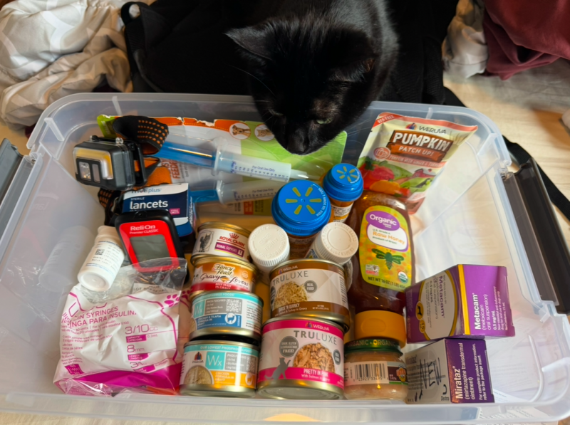 Mine is actually a little tote, all the things for testing, different carb’d foods, honey for hypos, and all the meds for any emergency situation (gabapentin, cerenia, ondansetron, mirataz, metacam), pumpkin for consumption, and syringe feeders.