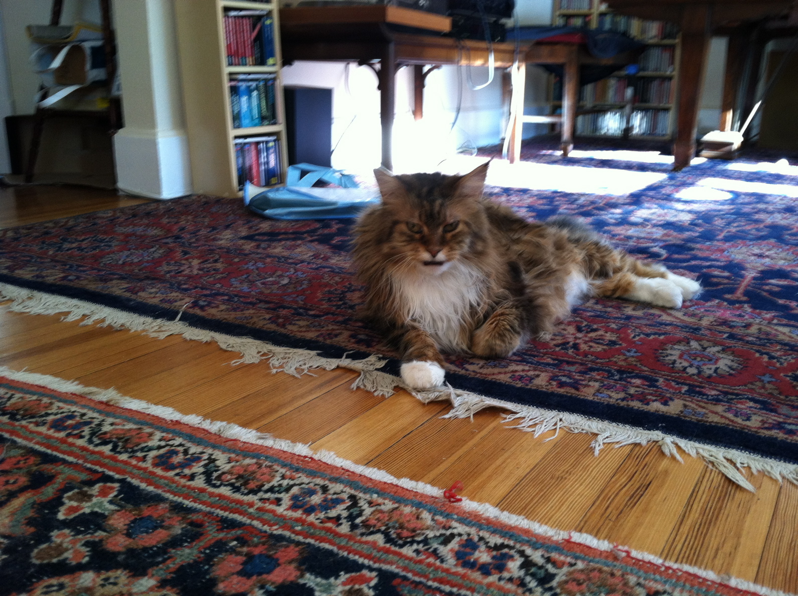 Rusty had a good night sleeping between his beans and is well into his morning routine: good test, good shot, good breakfast (Wellness Chicken/Turkey combo plate), and now a good nap in his little bed by the radiator. Weather is still mild, but we are expecting snow showers by tomorrow morning, just in time for our trip to NYC! Lots to do today to get ready.