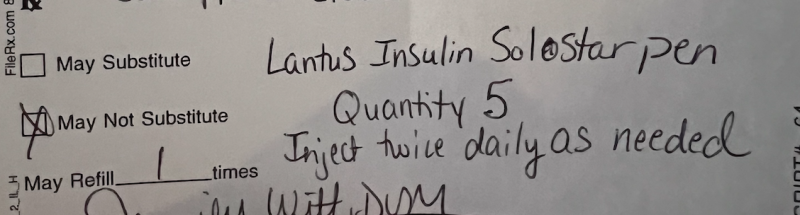 I've had a somewhat frustrating experience trying to get new insulin. I convinced my vet to write a prescription in the suggested format from this board for the 5 pens for $35 deal. I actually was smart and started this process with ~50 units still in my pen. That was last Monday when I dropped off the prescription at the Walgreens. I made sure that they would accept the coupon before they took my prescription and they said, sure, should be fine. The next day they let me know that they didn't have it in stock but it should be available soon - sure, no problem still had plenty in reserve. Didn't hear any updates, so I called in and they told me it will be ready Monday. On Monday, got an update it was going to be ready today. Today, got an update it was going to be ready tomorrow.