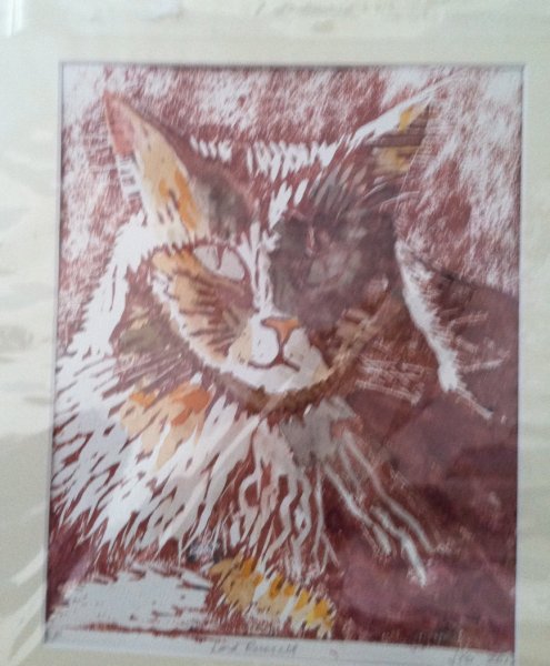 Tomorrow, weather permitting, we're driving to Potsdam to see an art show, the proceeds of which will go to the Potsdam Humane Society. The show is devoted to pictures of animal companions. And there will also be portraits of some of the shelter cats and dogs. Our friend has two portraits in the show: Rusty's portrait (a lino-block print that some of you may remember) and a lino-block print of his cat, Minerva. We'll have lunch with our friends, visit the show, and come home. I hope the roads will be good. Rusty will hold the fort. Here's our copy of the Rusty block print. The exemplar in the show is apparently somewhat darker in color.