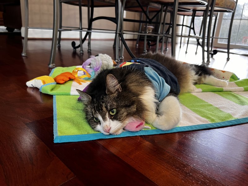 She is so beautiful, Staci! :kiss::cat: And she looks so content on her little beach towel with toys at the ready. You did a great job of applying the brakes to her slide last night. Keep up the good work! :bighug::bighug::bighug: