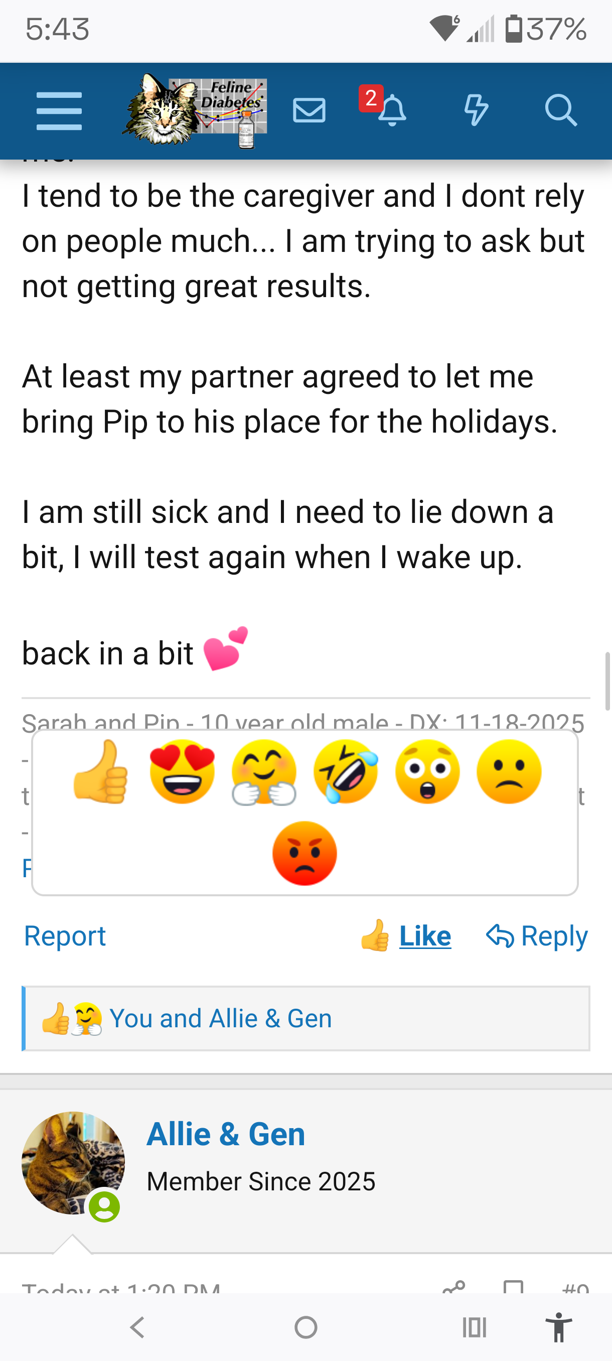 Obviously, people have made due with blood testing just fine for many years and it's even still recommended as a supplement if you have a CGM. But the CGM means that when I have to leave Gen home alone for hours, I'll know if his BG suddenly takes a dive and lifesaving interventions are necessary, and that would be a pretty big incentive for me even if he weren't so miserably resistant to having his blood taken. The Libre means I have to put him through a procedure he objects to intensely once every two weeks (usually/ideally) ... instead of multiple times a day. (At least. Back when I was trying to do blood testing, I failed to get a result from most of the tests on top of the awful experience of performing them, for both of us.) This will obviously vary enormously based on the human(s) and cat involved! I'm not trying to convince you by any means, but I know how nerve-wracking it can be to have to leave your cat for hours every day when they're not regulated, so I'm just sharing info in case it's of any help. ❤️