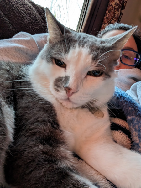 He looks grumpy, but he is purring and giving me a morning snuggle, which is new! I usually only get an early evening snuggle.