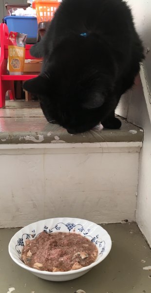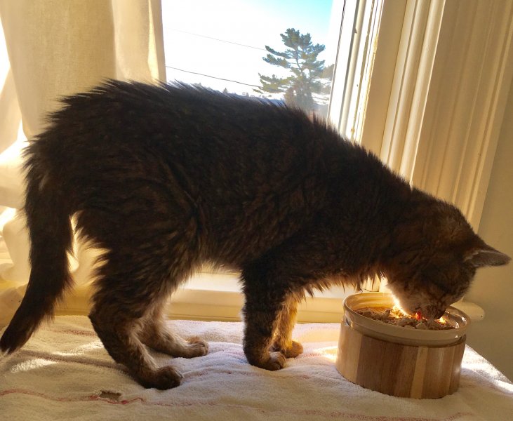 Sootie's ambg 73, at stair landing this morning very curious about the fud ascending as slowly as I was. Ate some before guzzling remedy and time for ear prick. She began to dabble in breffis again. That is, until bff's Bella and Dancer converged on the breffis scene.