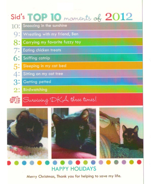 I hope you can all see the card attached so that you know how grateful we are for all of the good advice and support you all offered in 2012. Last year in January, the vet's told me that Sid only had a couple of months to live, but thanks to everyone here, he was able to enjoy 2012 and hopefully many more years