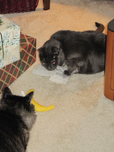 Mannie is one happy dude! Santa Claws brought him new nanners. WOOT, and MINE says Mannie... no says the bean, you have to share with your sisters. Noooooooooo says the cat. He corralled them all up sometime during the night, and now has a very nice nanners nest to sleep on. I had to laugh this morning: we were starting his test, just ready to poke when he bolted. :shock: Seems one of the civvies was within inches of the nanners. Oh the horrors! :o Breech in nanner security! :o :o Once order was restored he returned to his test spot, and we began our day. breffis consumed, preening completed, purrs in order, nanners secured, napping in progress.