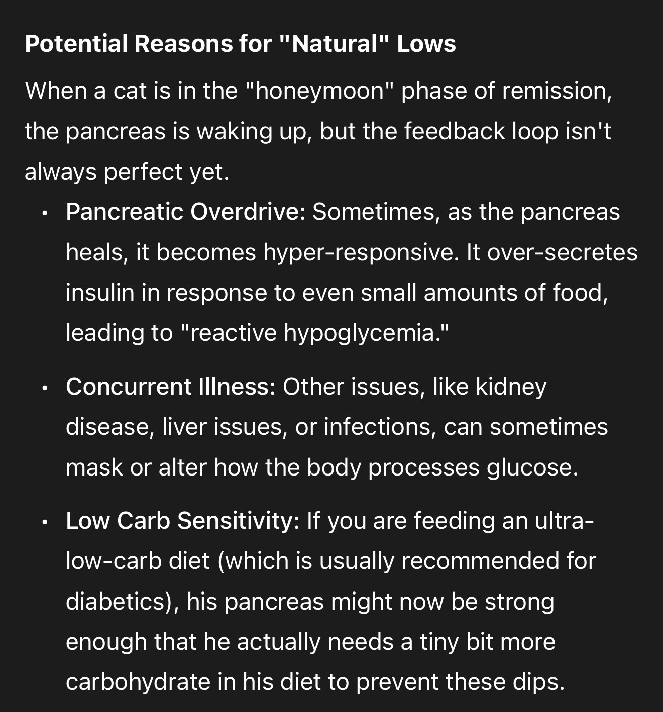 I know, it’s only been recently that you’ve seen numbers under 50. Numbers in the 40s or 50s are common with non-diabetic cats and with testing with human meters. We just don’t want cats to be in the 30s or 40s who are being given insulin, since with TR the safety measures are when giving insulin that we intervene with numbers under 50.