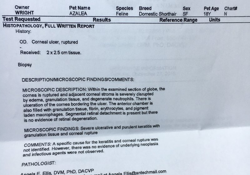 OV ecstatic about azalea's recovery. And she was sweet, mellow and in full ebulliance. The study of enucleated eye came back neg for cancer. Whew!