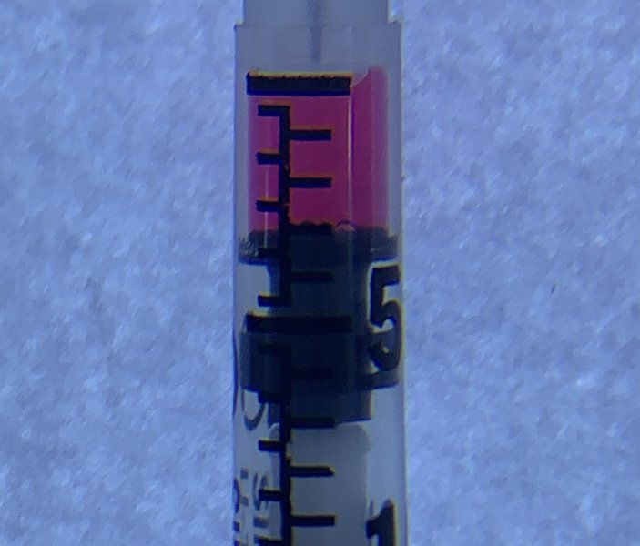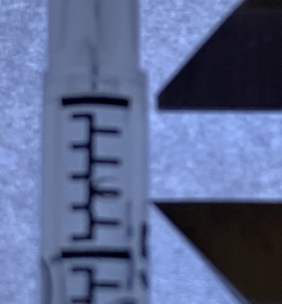 Can you clarify (for my post cataract poor close vision issues, even with a light box and lighted magnifying glass and even with viewing the videos on the “Dosing with Calipers” Info Sticky, does the top of the black plunger come to the bottom of the black line when measuring a dose. For instance, as in these attached photos (which are the best I could take), is 3units correct in the first photoWhere the plunger is at the bottom of the black line, or is it the second photo, with the black plunger at the top of the black line at 3unit black line?