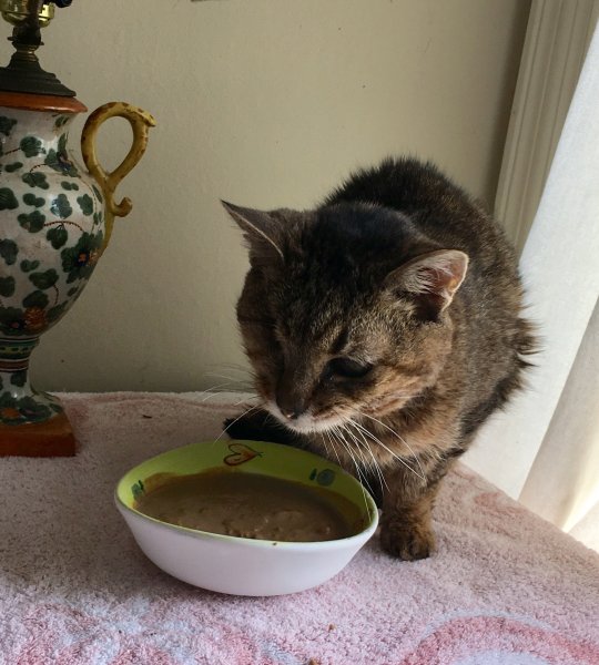 Her fud still includes her liver shake appetizers (have also been including radcat raw turkey with the rest of the ingredients). And lapping it up without diving her chin into it!