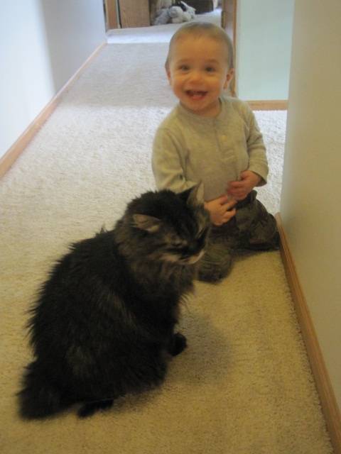 Nicholas and Mannie, Mannie and Nicholas. Best buds for life! Yesterday when I came home from picking up DGS in the Morning, there was Mannie, waiting at the top of the stairs, prancing back and forth. You could just read the thoughts" "Where have you been? What took you so long! I have been waiting FOREVER!". It was about this point that Nicholas sees his buddy and lets loose with this rather infectious giggle, and a smile to top it all off. So we waited while those two exchanged greetings... Out of the corner of my eye I could see Elsa... slinking... so so close... ever so quiet.... the nanners were unguarded! And sure 'nuf: she snuck in a play while Mannie was busy with his "Where have you been!". :lol: :lol: :lol: :lol: :lol: