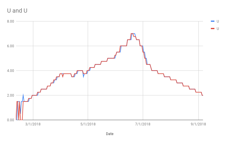There have only been a handful of blue numbers (since August, only 4 blue readings -- since July 9, only 9 blue readings; July 9 is kinda where he started to get green numbers consistently).