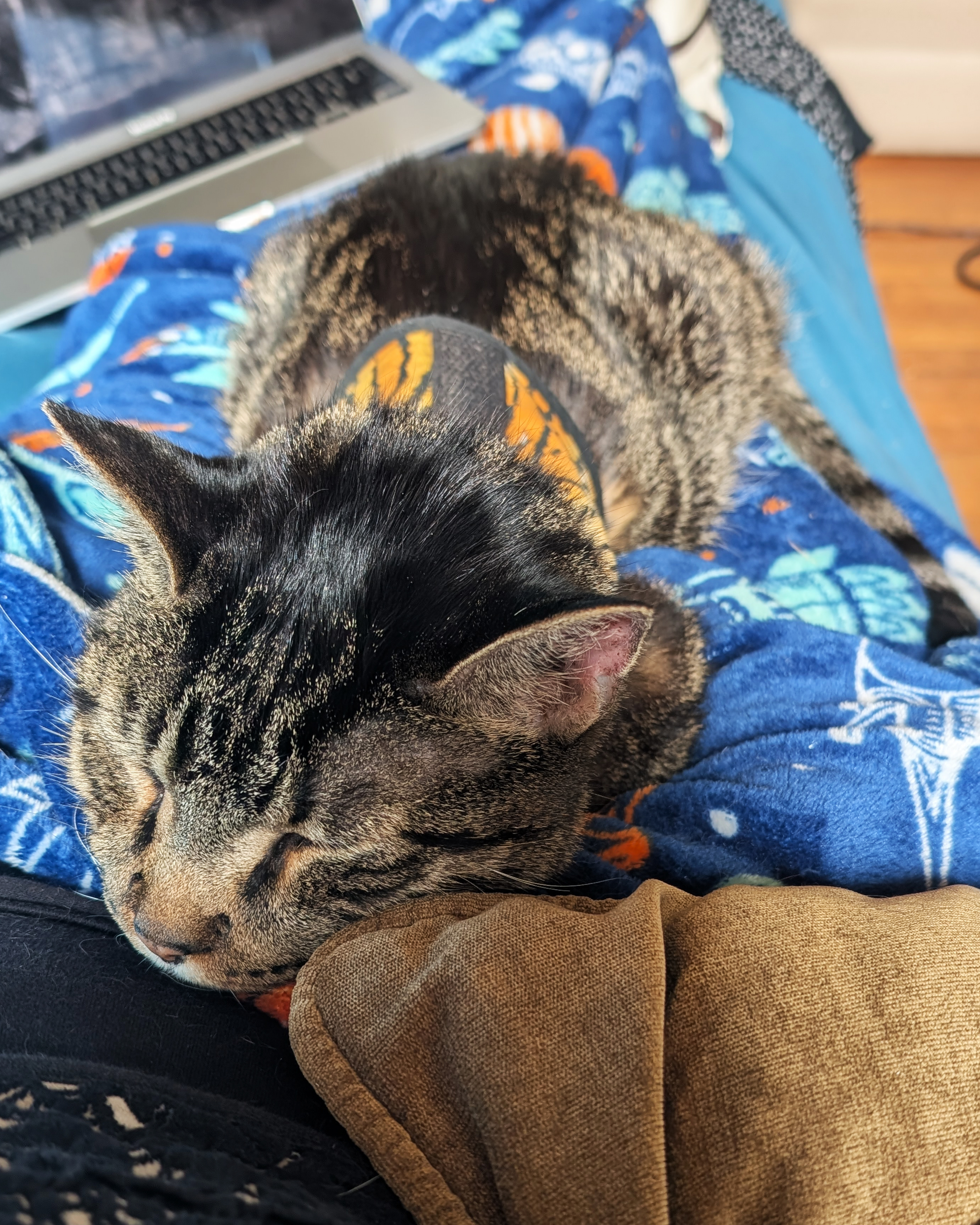 It's quite cold out today (below freezing), and in a dramatic shift from the usual issues with my apartment building, the heat is completely out. (Apparently a boiler problem they're working to repair.) Gen is very kindly helping me stay warm.