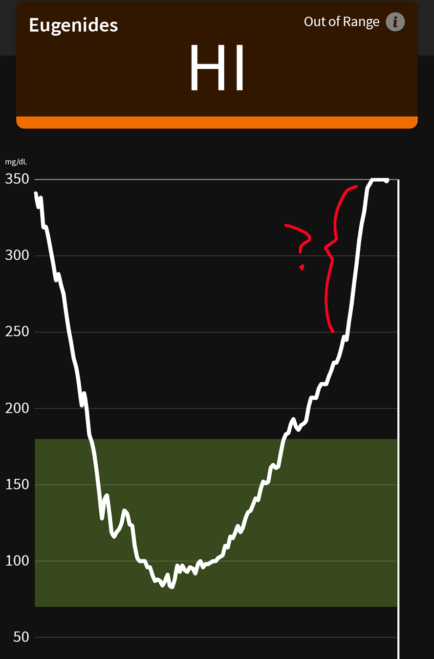 It's not even the high that freaks me out (though it is his first red in an entire month and I was hoping not to ever see that color again) ... it's the steepness of the curve. He had a green nadir. I have no idea what to do wrt TR rules and increasing or not tomorrow, if he's having nadirs under 100 (but AMPS and PMPS are both sky high).