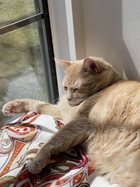 Jude’s enjoying the warm sunshine in his window bed today—what a rough life.