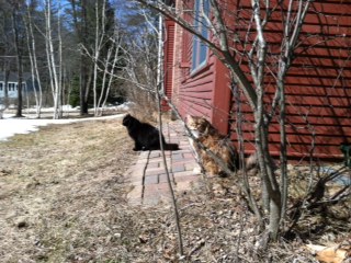 Shadow lives across the street, but spends most of his time outside (and a lot of it in our yard). He is about 3 years old and Rusty cannot abide him. They "meet and greet", touch noses, and then Rusty hisses or swats at Shadow and Shadow flits away. He is very athletic. I think that he wanted to be Rusty's friend at one point, when he was an adolescent, but Rusty would have none of it. The picture was taken after Rusty "ran" Shadow off.