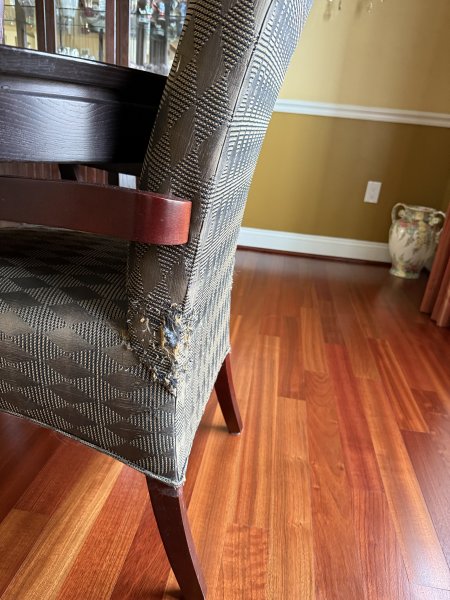 I laughed out loud. Sorry.Why we can't have nice things at our house. (This is Hazel's handiwork.) Cats!