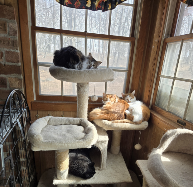 The favorite four season corner...LOL! Edmund on top, William (L) and Butterscotch (R) in the middle and Jack snoozing on the bottom