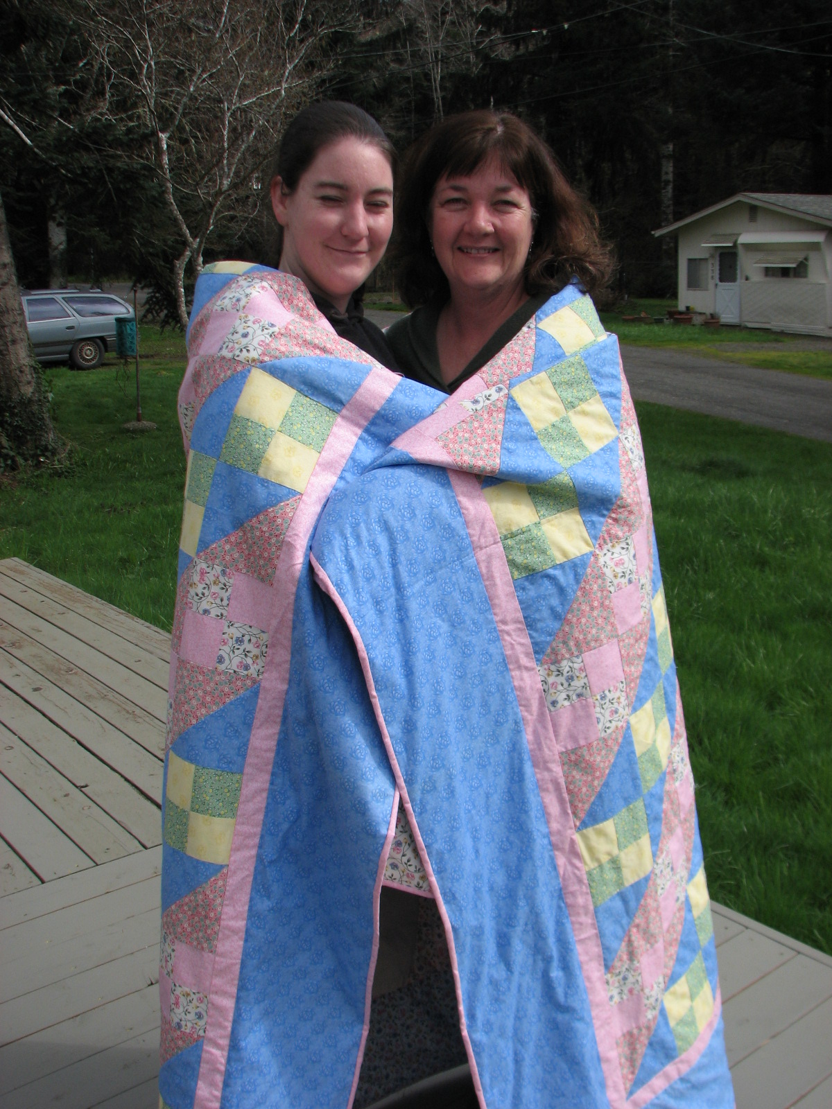 practicing my newfound attach pic skill, here's a pic of my daughter & i with the quilt. She picked the fabrics when she was 9, so it's not what either of us would've chosen now, but that's ok. it's kinda old-fashioned looking. it needs some more quilting in the blue border, but i'm going to add it later. i wanted to get it to her and off my to-do list.