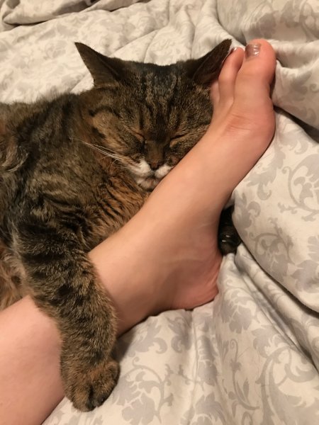 Here is a photo of Asia the foot cuddler, she likes younger daughter’s feet for some reason becuase she does this a lot to her and never with anybody else. She will see her foot, grab and hug it, and then fall asleep. It’s too funny and adorable.
