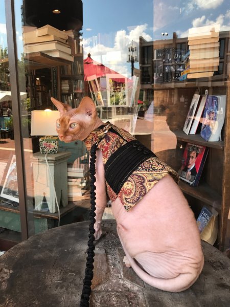 Today’s Daily Disco Photo was taken in Virginia in front of a bookstore in the plaza where the vet clinic I worked at was located. He’s wearing en elegant vest made by Mister Migs, a creative company that hires work-challenged kids and uses all recycled fabrics. If your kitty is agreeable to dressing up, they make fashionable harnesses that double as stylsh outfits and you can check them out here: https://mistermigs.com