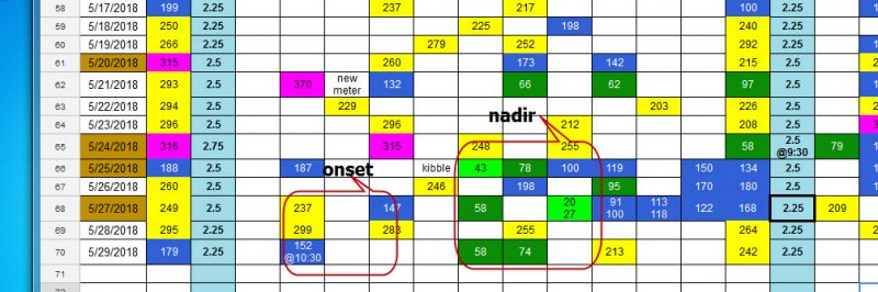 I meant, like a chart, using what you just said about her SS, like this:To me, it looks like her onset is +2.5-+3ish. It looks in the daytime that she typically nadirs +6 to +8 timeframe, when I try to determine this, I look for cycles that are similar or as close to a “normal” cycle as possible (as in no bounce or super high pre shot number, etc.), so today’s I compare to 5/25 and 5/27 am cycles. A template would be nice, and one does exist, but the problem is ECID so you results may look quite different. It’s really tricky to see patterns sometimes, especially if they are not very predictable and well regulated. That’s why I try to look for like/similar cycles to compare to the one I am seeing to get an idea. And of course, you can’t really analyze a cycle on its own, you have to step back and look at the big picture and try to see the patterns that way, what is the overall trend/color pattern, how long bounces last, what a failed reduction might look like, are bounces from food, a low, a steep drop? It’s a lot to unpack and it isn’t always clear anyway. Looking big picture, in the month of May, Mouse has seen much better numbers overall than she was seeing previous to this. It’s progress for sure and you have to celebrate that!