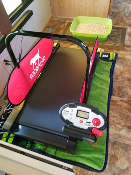 Will start feeding him on it today and when he is comfortable being on it I will turn it on while he is in the room and just let him get use to it moving then I will harness him and place him on it while it is off and see how he does. Once we are able to get him on it I or DH will lift him a bit off of it while it slowly moves and see how he reacts. Baby steps hopefully it won't turn into a clothes hangar.