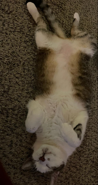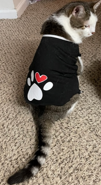 Pics as promised with the onesie. It is actually for a large dog and I cut it to fit his "fluffy" size and cover only what is needed because it was very long. Despite looking extra dashing in it, he was very sad so I removed it this evening. And look how happy he is. Just have to keep an eye on the Libre.