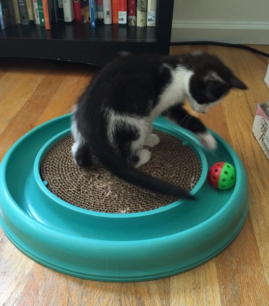 The three baby girls are doing well at my friend Kristen's house. She took them to work with her yesterday (she's a vet tech) and, unfortunately, Fern's eye will have to be removed. It has already ruptured, she can't see out of it anyways and it is only causing her pain. Since she is still so little and anemic, they want to wait a few days to put her under, but her surgery is tentatively scheduled for next Friday (June 10). Amazingly enough, Fern is social and playful and loves the turbo scratcher.