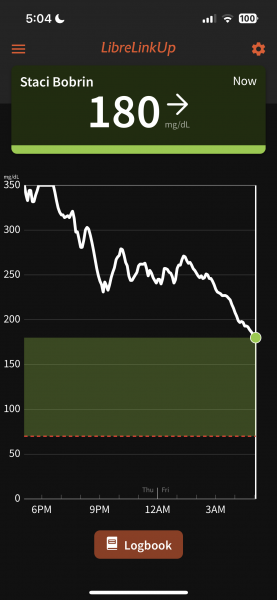 Speaking of cycles, I'd like to suggest you start looking at the numbers the way the SS is set up, which is how we look at numbers here. A cycle refers to the period of time between shots. There are 2 cycles in 24 hours. While it is good to look back at previous cycles particularly to see if you can establish some patterns, I do feel like the Libre graph perhaps continues to confound the situation a little. For example, I wouldn't look at it as that she dropped from 300 (midcycle last night) to 53s (early today) quickly, since that isn't quite right given the time frame in question and the number of hours involved. In "today's am cycle" she dropped from 149 preshot to 53 by +1 (and again, if you aren't inclined to question the validity of the 53), which is indicative of an active cycle. I think I mentioned this before, but it is a bit of an experiment, since it takes some time to see whether the carbs you are feeding are working or not. If it were me, I would say today's cycle and how you fed was fine, since you managed to stop the early drop.