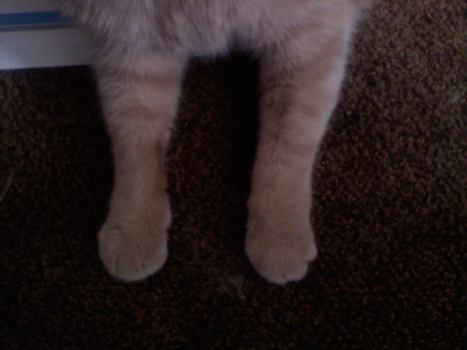 I've made an appointment with our vet for Friday morning. As you can see in the picture below, there's muscle wasting at the "ankle" of Champ's right leg (pictured on the left). I don't know if it's from neuropathy or something more serious. I want it to be from neuropathy because that's reversible when the neuropathy gets under control. He's been on the methyl B12 (Xobaline) for a month now and the facial twitching has stopped. The wobbly front legs continue, though, and now there's very noticeable muscle wasting. We'll see what the vet has to say on Friday. Everyone send up little prayers that it's not too serious.